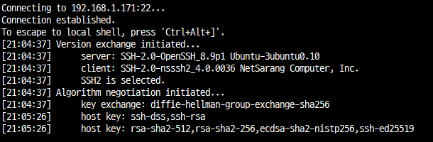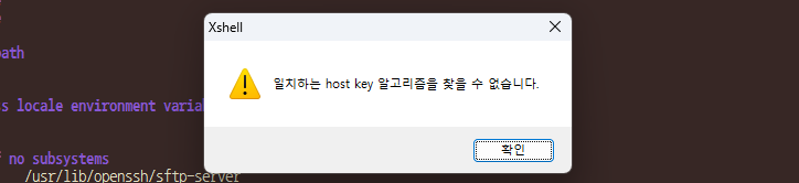 여기서 xshell이 제공하는 host key와 서버에서 제공하는 host key를 확인할 수 있는데, 서로 공유되는 key가 없기 때문에 연결이 성립되지 않는 것이다.